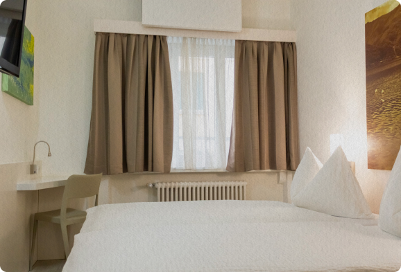 Le camere dell’hotel sono pensate per offrire un soggiorno pratico e confortevole, ideale per chi cerca una soluzione funzionale in centro a Lugano. Disponiamo di camere singole e doppie, tutte dotate di doccia, WC, televisione e telefono. Gli ambienti hanno uno stile semplice e informale, adatto a chi desidera una sistemazione comoda, senza eccessi.